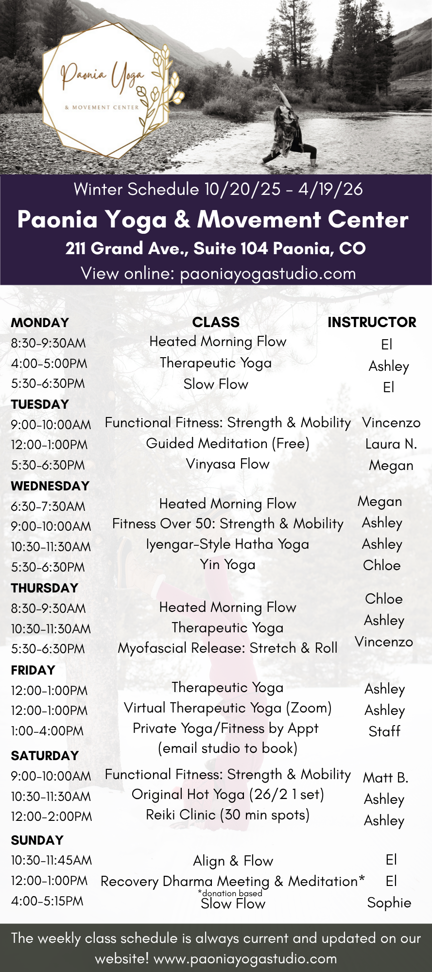If you have questions, we are eager to answer them. Holistic offerings like private yoga and energy work are available by appointment, email us to book. Please email us at contact@paoniayogastudio.com. You can also follow us on Facebook and Instagram to learn more about us and for updates and schedule changes.