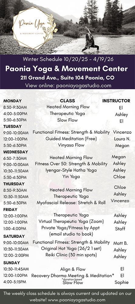 Drop-ins welcome, mats provided, the studio is centrally located across from Town Hall in the heart of downtown Paonia. This woman-owned and operated local business appreciates your support! You can also follow us on Facebook and Instagram to learn more about us and for updates and schedule changes.