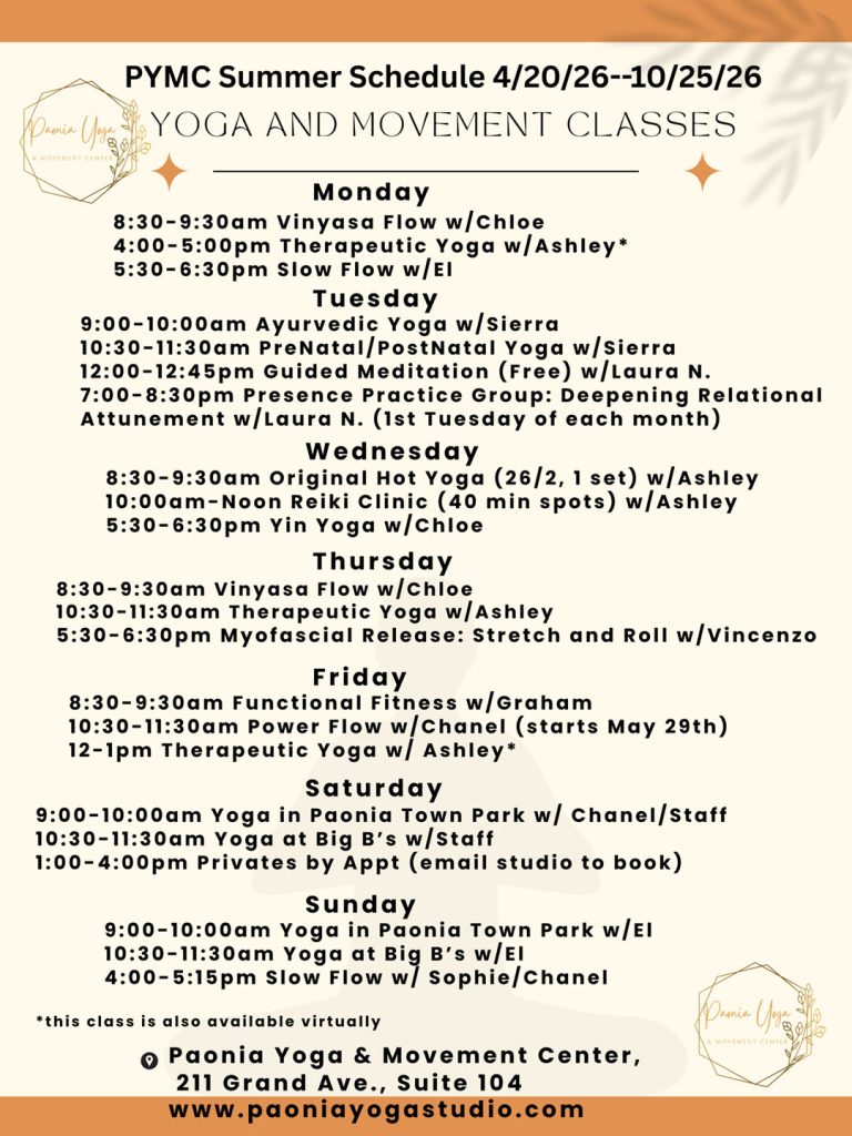 In addition to daily classes we feature workshops, teacher training, meditation classes, sound healing, off-site “event” classes, and other movement modalities. Holistic offerings like private yoga and energy work are available by appointment, email us to book. If you have questions, we are eager to answer them. Please email us at contact@paoniayogastudio.com.